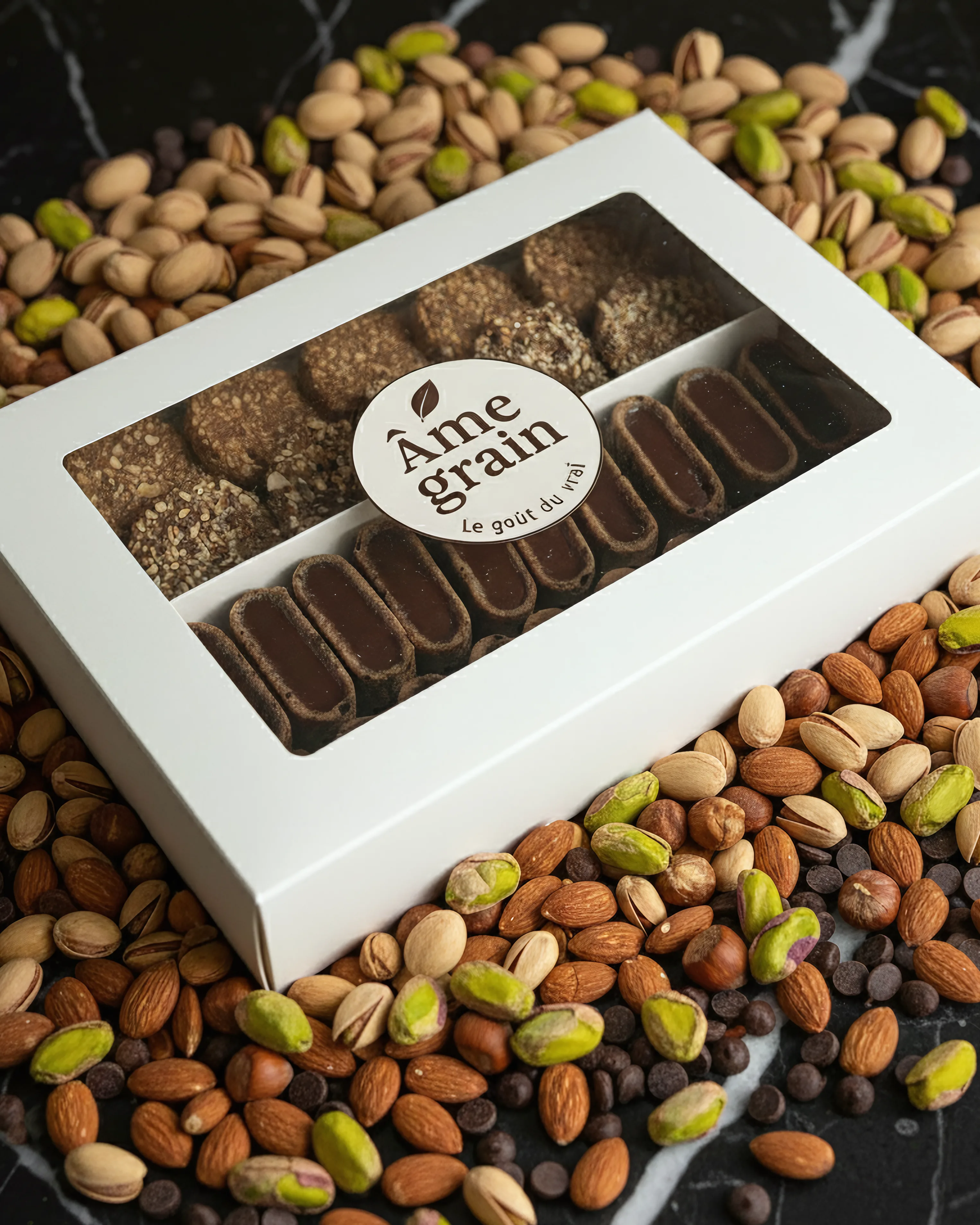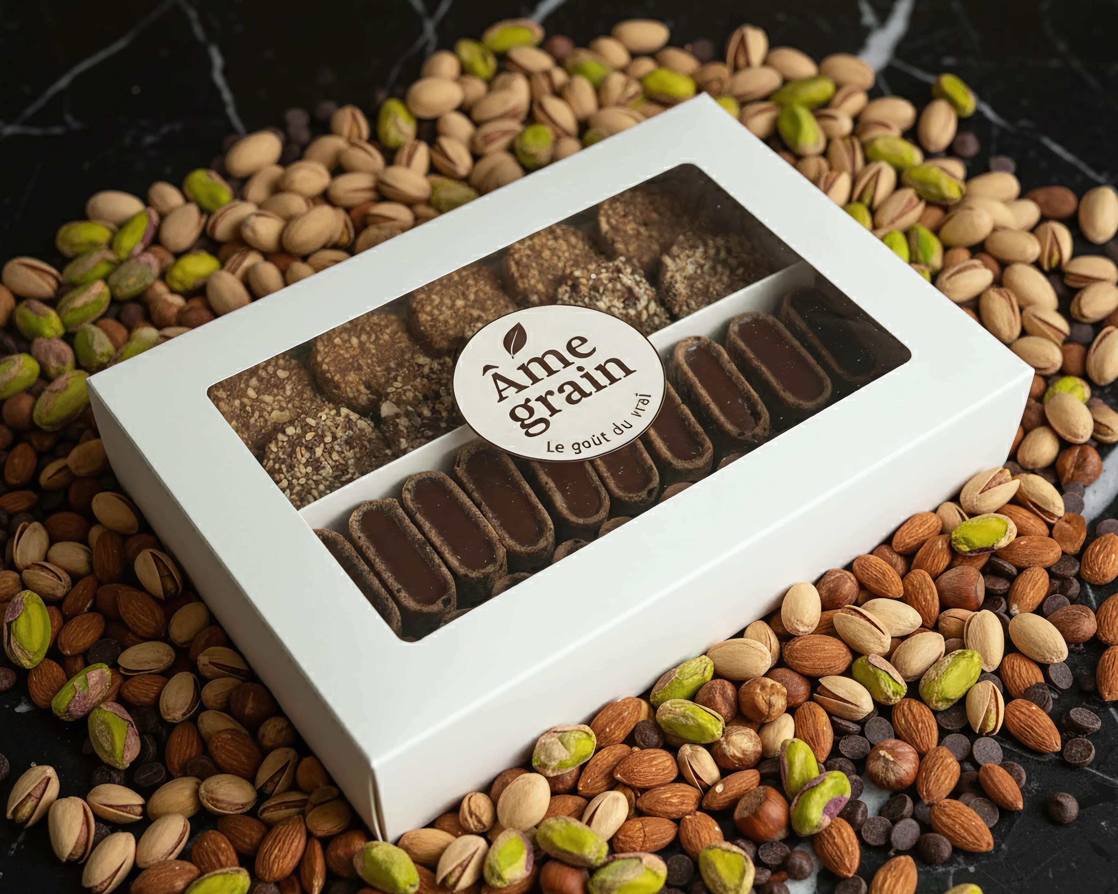 Chez Âme Grain, nous respectons des règles strictes de qualité. Tous nos produits sont faits à base de fruits secs de la plus haute qualité, sans additifs et sans colorants. Nous avons deux priorités: rendre la gourmandise healthy et accessible à tous, quelque soit leurs contraintes.